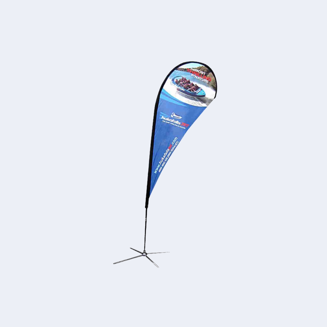 Teardrop banner (also known as flying flags, beach flags, or feather banners) designed for maximum visibility and durability. Available in 3.5m, 4.5m, and 5.5m height options for impactful outdoor and indoor branding.